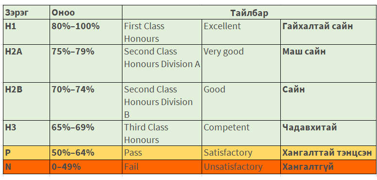 - H1 – 80-100%, First Class Honours – Excellent (Гайхалтай сайн)
